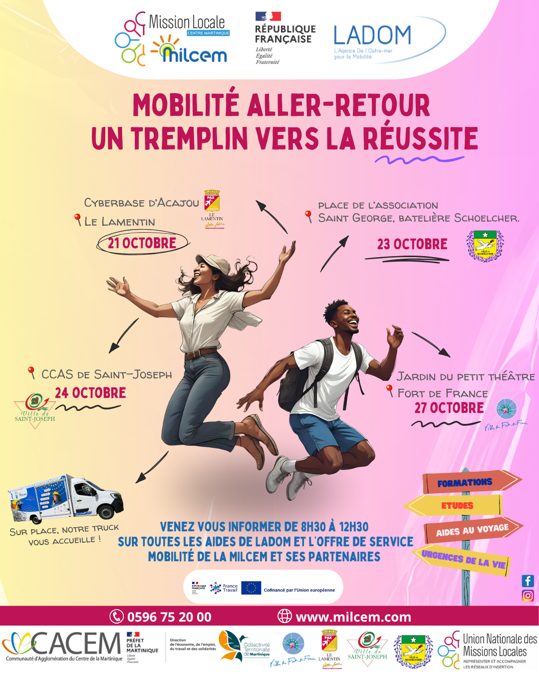La MILCEM, LADOM et France Travail organisent un tour des communes du 21 au 27 octobre 2025. L’idée de l’action “Mobilité aller-retour, un tremplin vers la réussite” est de proposer en un même lieu des aides, des opportunités, des conseils et autres informations pratiques autour de la mobilité.