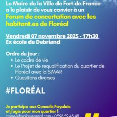 Lors du forum qui s’est tenu à Floréal le 7 novembre dernier, les Élus de quartier Mme Dondon Pauline, Peggy Charles et Claude Joseph, ainsi que le Maire Didier Laguerre, ont échangé avec les habitants sur l’avancement des différentes actions menées dans le quartier. Plusieurs thématiques ont été abordées : • L’élagage et la gestion … Lire la suite