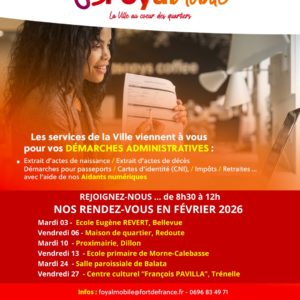 Découvrez les rendez-vous du mois de Février 2026 Les services de la Ville se rapprochent de vous ! Infos: foyalmobile@fortdefrance.fr ...