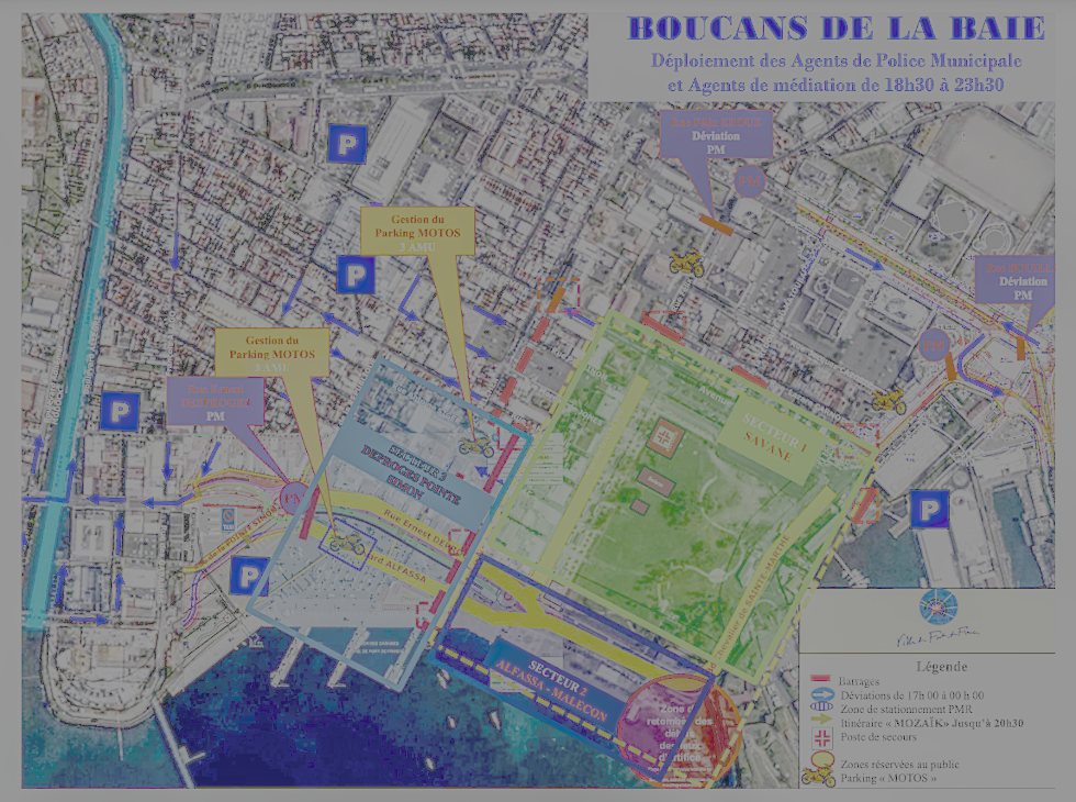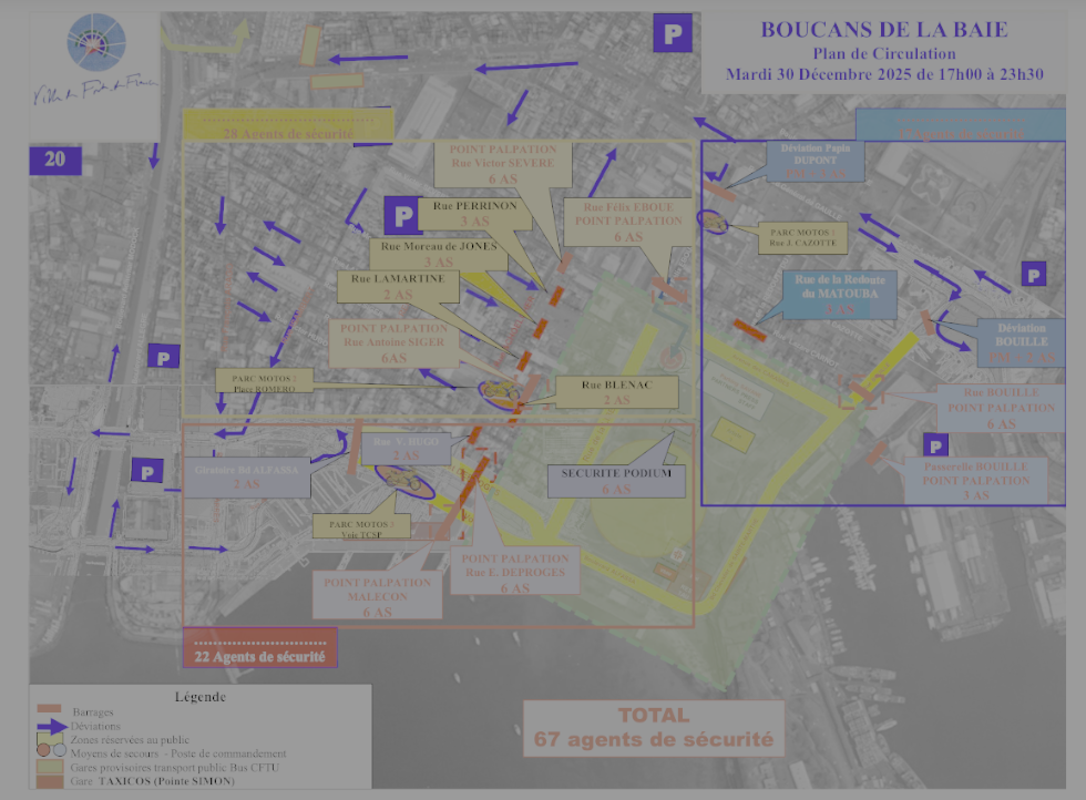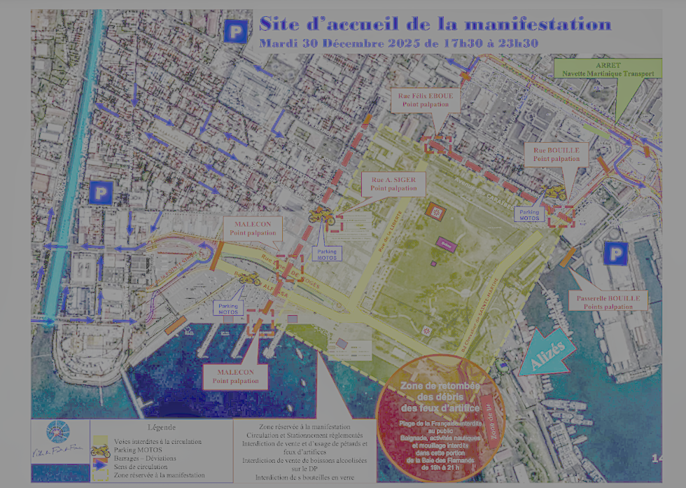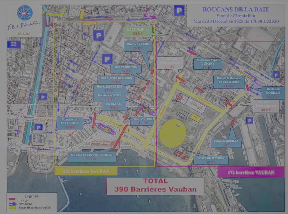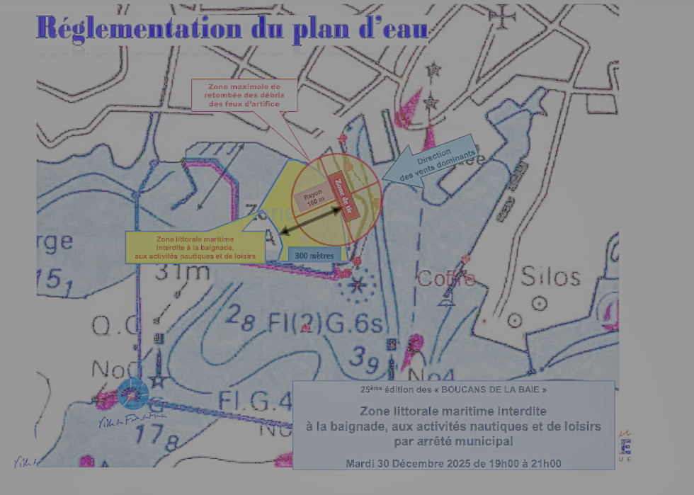Il est défini dans le centre ville le Mardi 30 Décembre 2025 entre 17h30 et 23h30, une zone réservée eux "BOUCANS DE LA BAIE". Cette zone formant un quadrilatère est constituée des espaces publics délimités par les voies et espaces publics suivants: